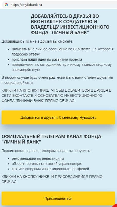 Аферисты Ми ФХ Банк ведут сбор данных о пользователях своего сайта предлагая добавиться в друзья в социальных сетях таких как Вконтакте, а также Телеграм.