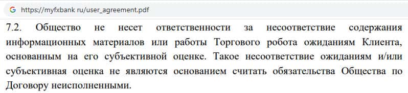 Мошенники MyFxBank полностью снимают с себя ответственность за содержание предоставляемых ими информационных материалов ил работы торгового робота.