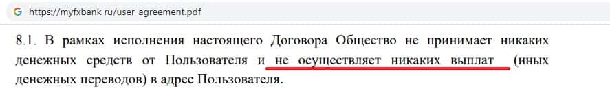 Жульническая контора MyFxBank в своем пользовательском соглашении указывает информацию о том, что не осуществляет какие-либо выплаты.