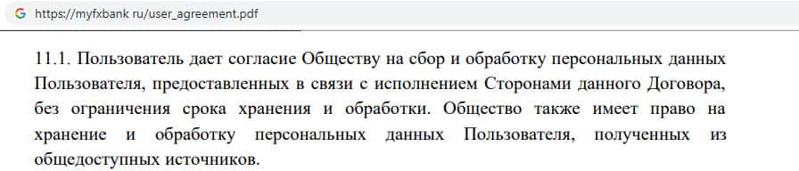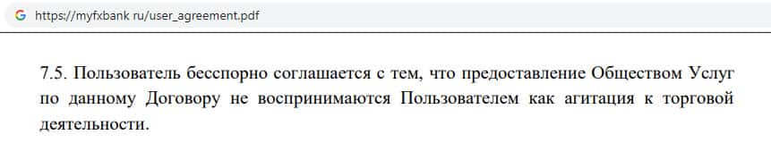 Пользовательское соглашение на сайте скам-организации Ми ФХ Банк