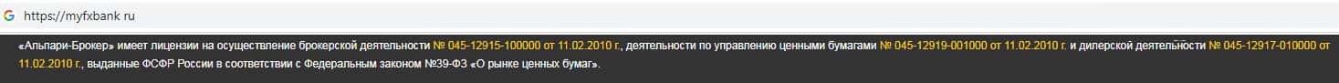 Мошенники Ми ФХ Банк вместо информации о своей лицензии предоставляют информацию о фейковой лицензии скам-компании Альпари.