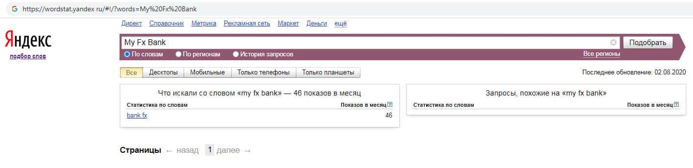 По запросам по бренду названия компании на английском языке с пробелом "My Fx Bank" на Вордстарт Яндекс Ру показатель 46 показов за месяц.