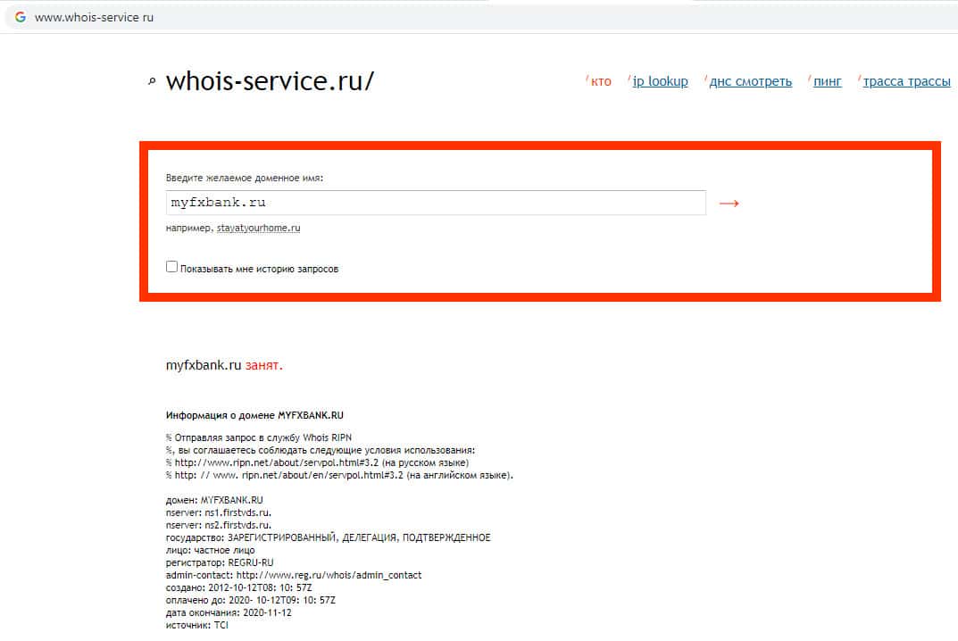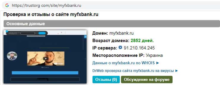 Проверка интернет-сервиса аферистов MyFxBank на trustorg com показала, что возраст домена к моменту написания статьи составляет 2852 дня, скорее всего домен купленный.