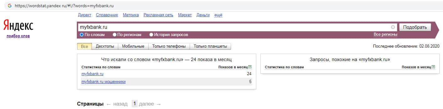 Количество запросов по бренду названия домена с точкой "myfxbank.ru" на wordstat yandex ru всего 24 запроса за месяц.