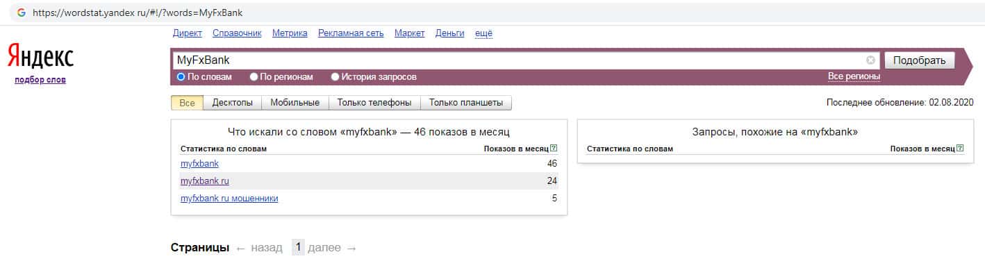 По брендовым запросам англоязычного названия компании без пробела "MyFxBank" в поисковике Yandex показатель все тот же, а именно 46 запросов за месяц.