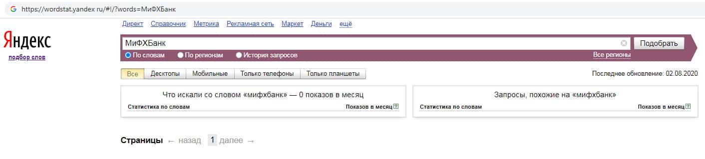 Также в поисковике Яндекс нет никакой информации о брендовых запросах русскоязычного названия компании с пробелами "Ми ФХ Банк".
