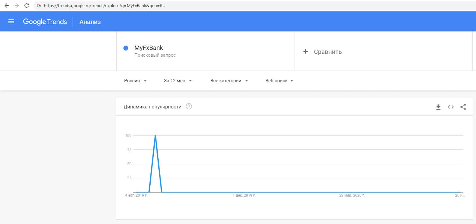 Также нет никаких дынных о брендовых запросах названия компании на английском языке с пробелом "My Fx Bank" на trends google ru.
