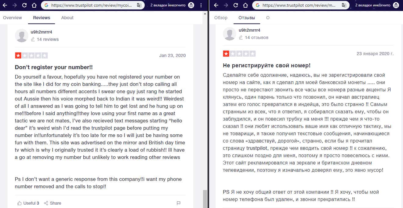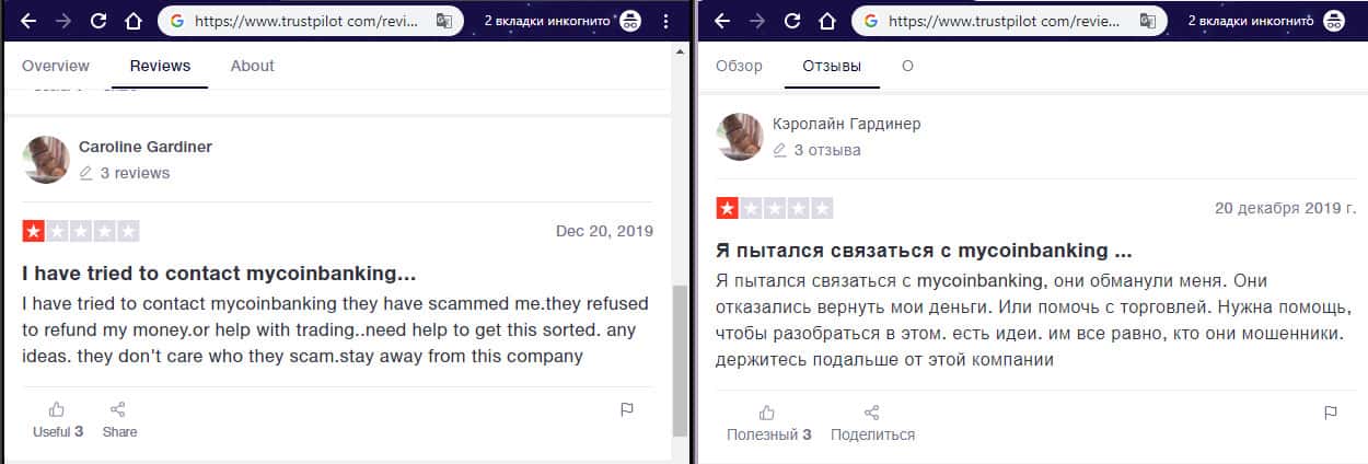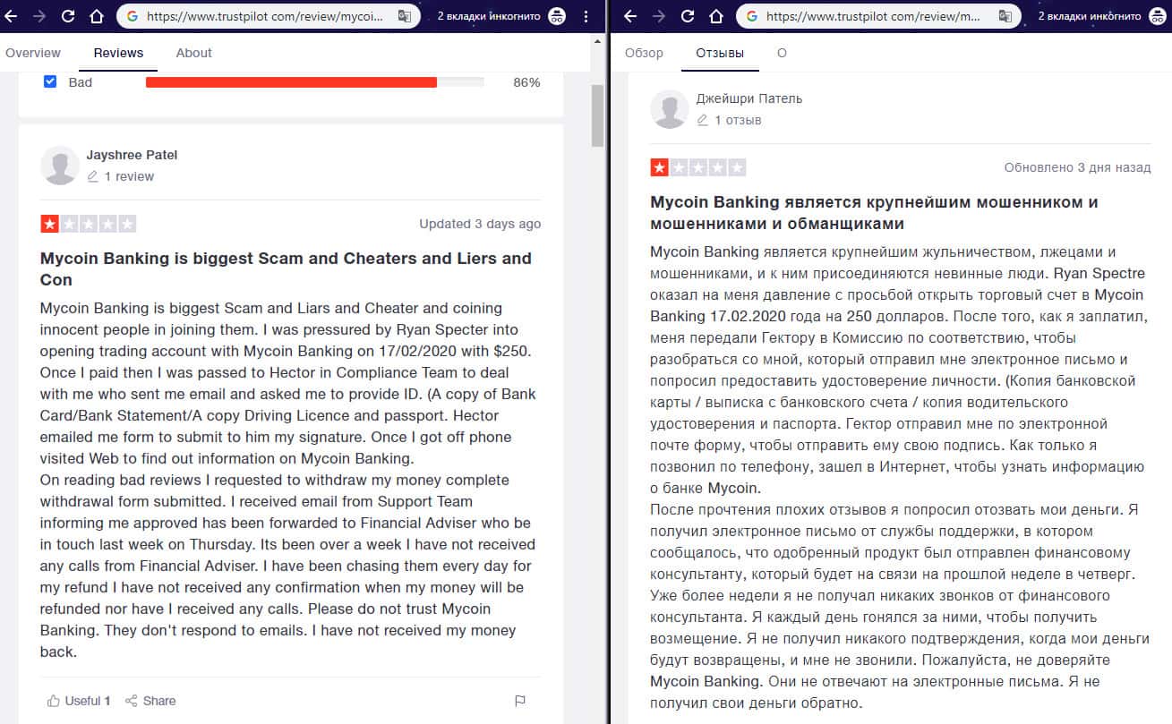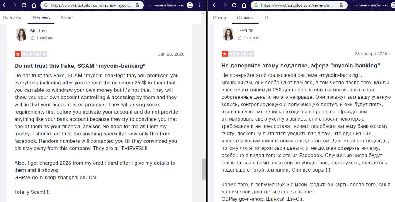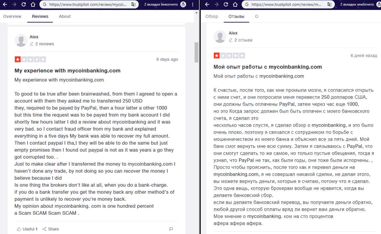 - Негативный отзыв об аферистах MyCoin-Banking с веб-сайта трастпилот ком