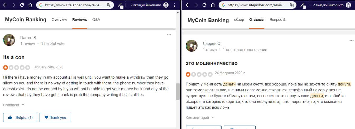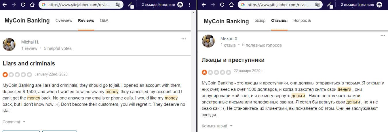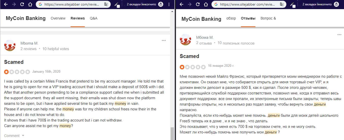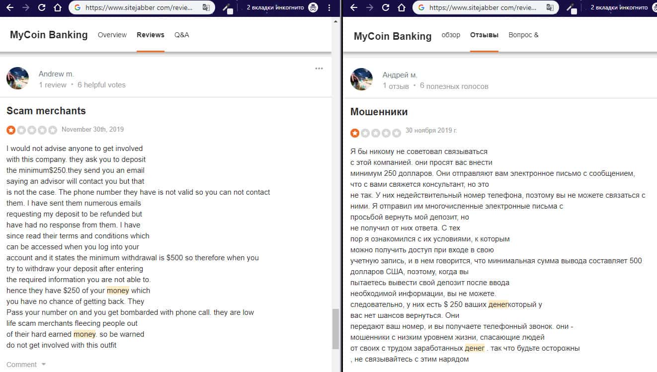 Негативный отзыв об аферистах MyCoin-Banking с веб-сайта трастпилот ком