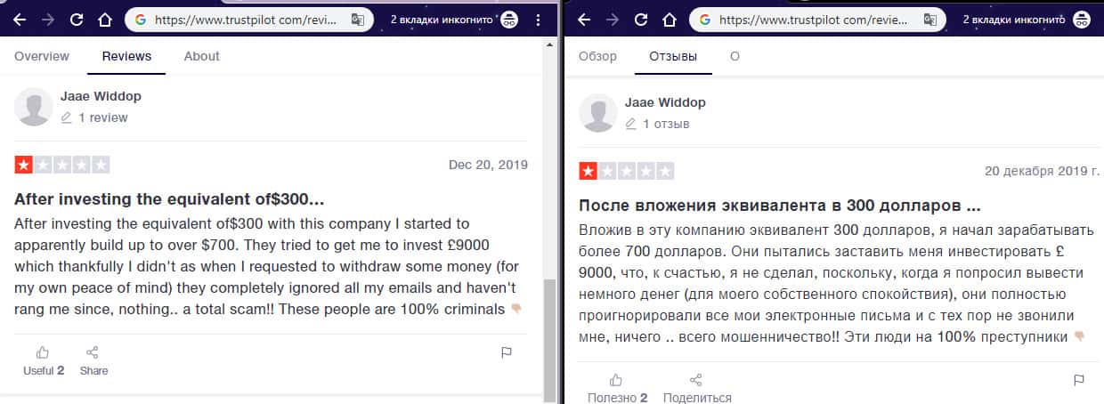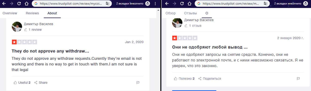 Ниже вы можете прочесть еще один реальный негативный отзыв в сторону шулеров MyCoin-Banking с веб сайта трастпилот ком, от очередного наивного пользователя сети интернет, который повелся на уловки мошенников Ми Коин Банкинг и вложил в данную контору свои средства, после чего шулера MyCoin-Banking отказались их выводить, но потребовали еще.
