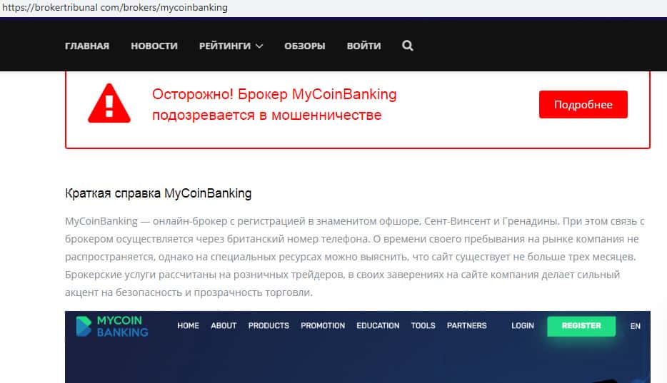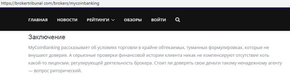 Ввиду мошеннической деятельности аферистов MyCoin-Banking на просторах сети интернет веб-сайт брокертрибунал ком посвятил мошенниками Ми Коин Банкинг информационную статью, которую он сразу начал с заявления о том, что аферисты MyCoin-Banking являются конторой, которой доверять определенно не стоит, что вы можете увидеть на изображении ниже.