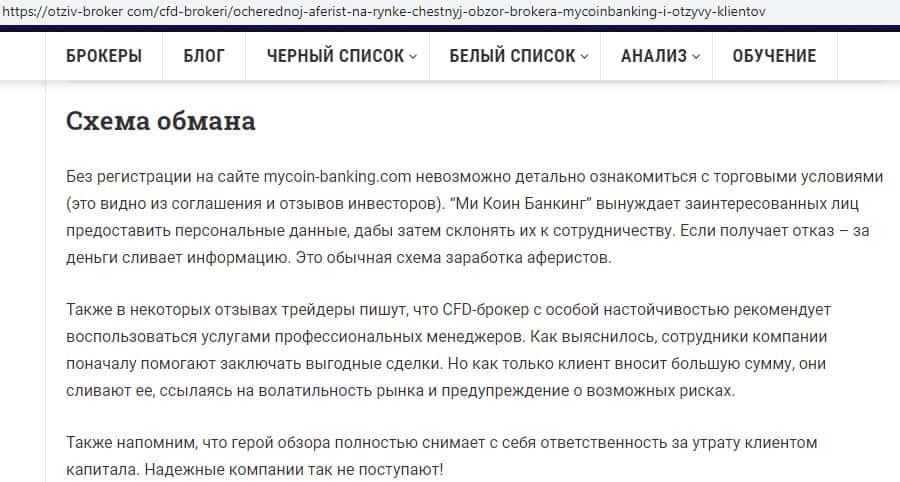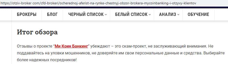- Негативная статья об аферистах Ми Коин Банкинг с веб-сайта otziv-broker com