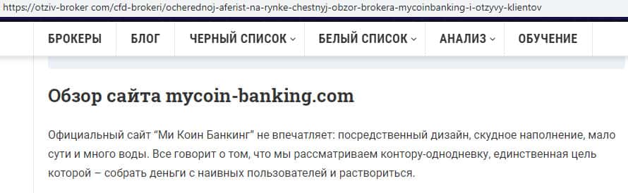 Негативная статья об аферистах Ми Коин Банкинг с веб-сайта otziv-broker com