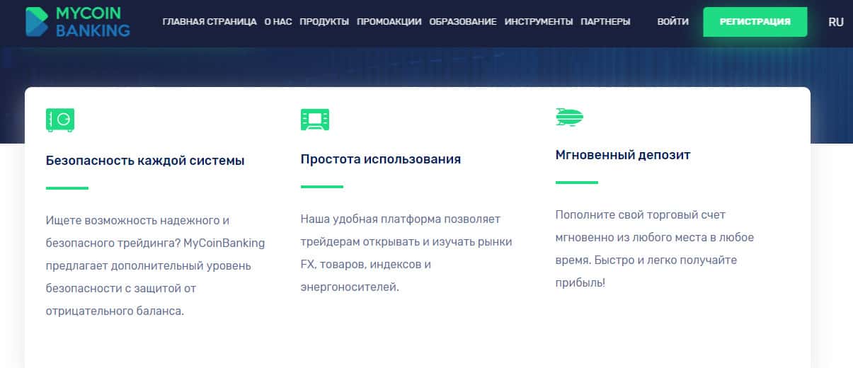 Далее на сайте жуликов Ми Коин Банкинг следует довольно стандартный и типичный раздел, в котором лохотрон MyCoin-Banking начинает вешать пользователям лапшу на уши в виде своих довольно сомнительных преимуществ, подтвердить которые аферисты Ми Коин Банкинг никак не могут. Ниже вы можете наглядно увидеть следующий раздел сайта шулеров.