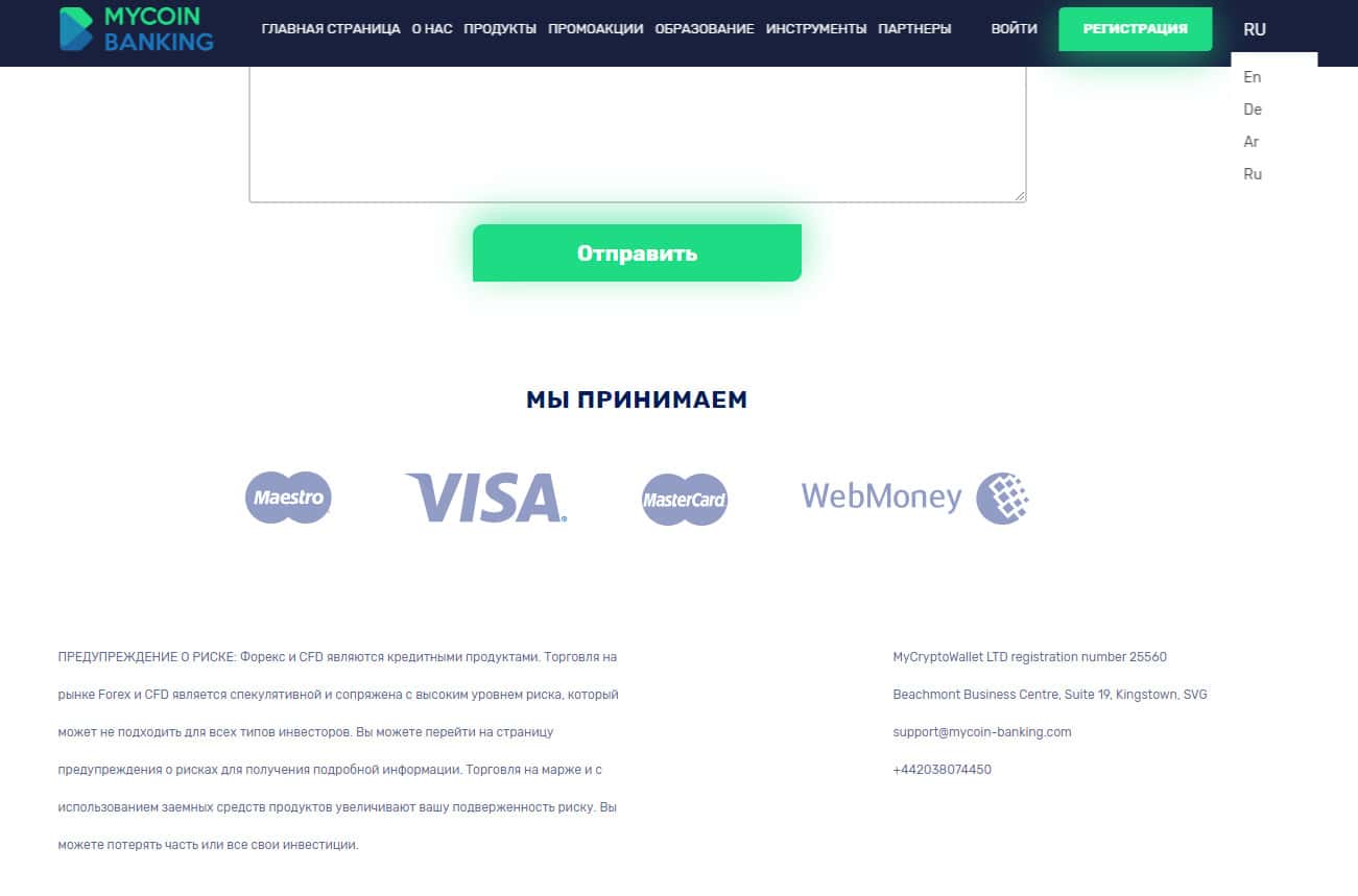 Завершается же подвальный сайт у аферистов Ми Коин Банкинг довольно стандартно и ожидаемо, а именно банальной формой обратной связи с наивными пользователями, а так же предупреждением о рисках, в котором лохотрон MyCoin-Banking отказывается от ответственности за потери наивной клиентуры, связанные с подвальным сайтом проходимцев.