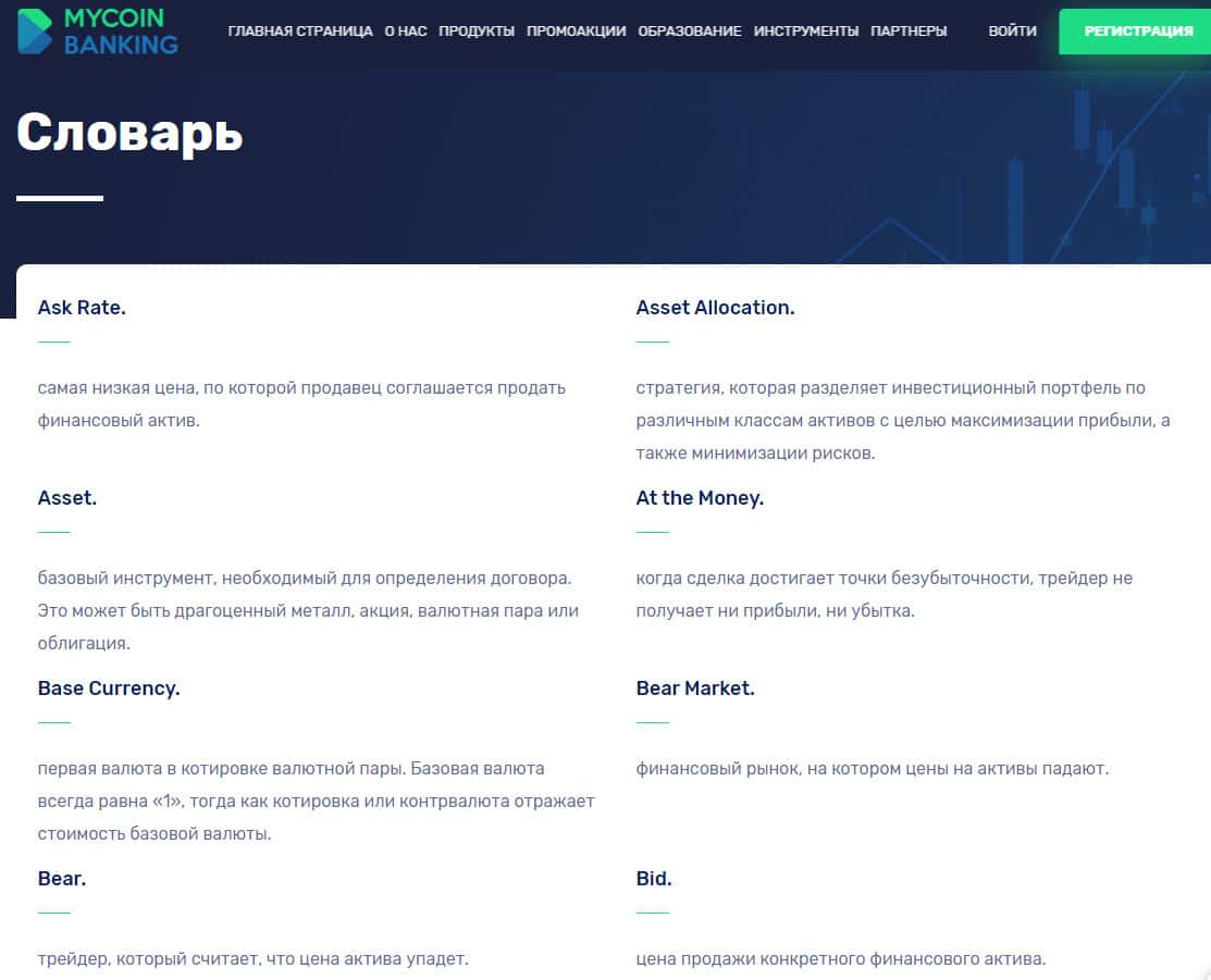 Для начинающих трейдеров проходимцы MyCoin-Banking чисто для галочки сделали раздел с помощью, который попросту является банальным словарем терминов и не несет никакой смысловой или же информационной нагрузки и добавлен лохотроном Ми Коин Банкинг чисто для виду. На изображении, расположенном ниже, вы можете увидеть данный раздел сайта жулья.