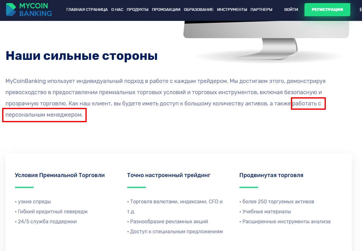 Несмотря на довольно малый возраст мошенников Ми Коин Банкинг они все же умудряются зарабатывать на наивных пользователях сети интернет. Одной из таких схем является ловушка для наивных, суть которой состоит в том, что жулье MyCoin-Banking "якобы" по доброте душевной предоставляют личного менеджера, который на самом деле попросту сливает деньги клиенту.