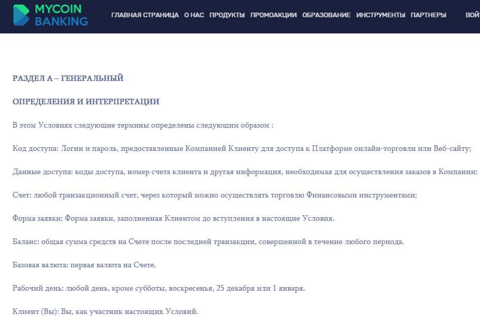 Условия сотрудничества у лохотрона MyCoin-Banking начинаются довольно нестандартно, а именно с перечня определений, используемых в данном документе, которые не несут никакой информационной или смысловой нагрузки и расположены аферистами Ми Коин Банкинг исключительно для виду. На изображении, расположенном ниже, вы можете увидеть начало условий.