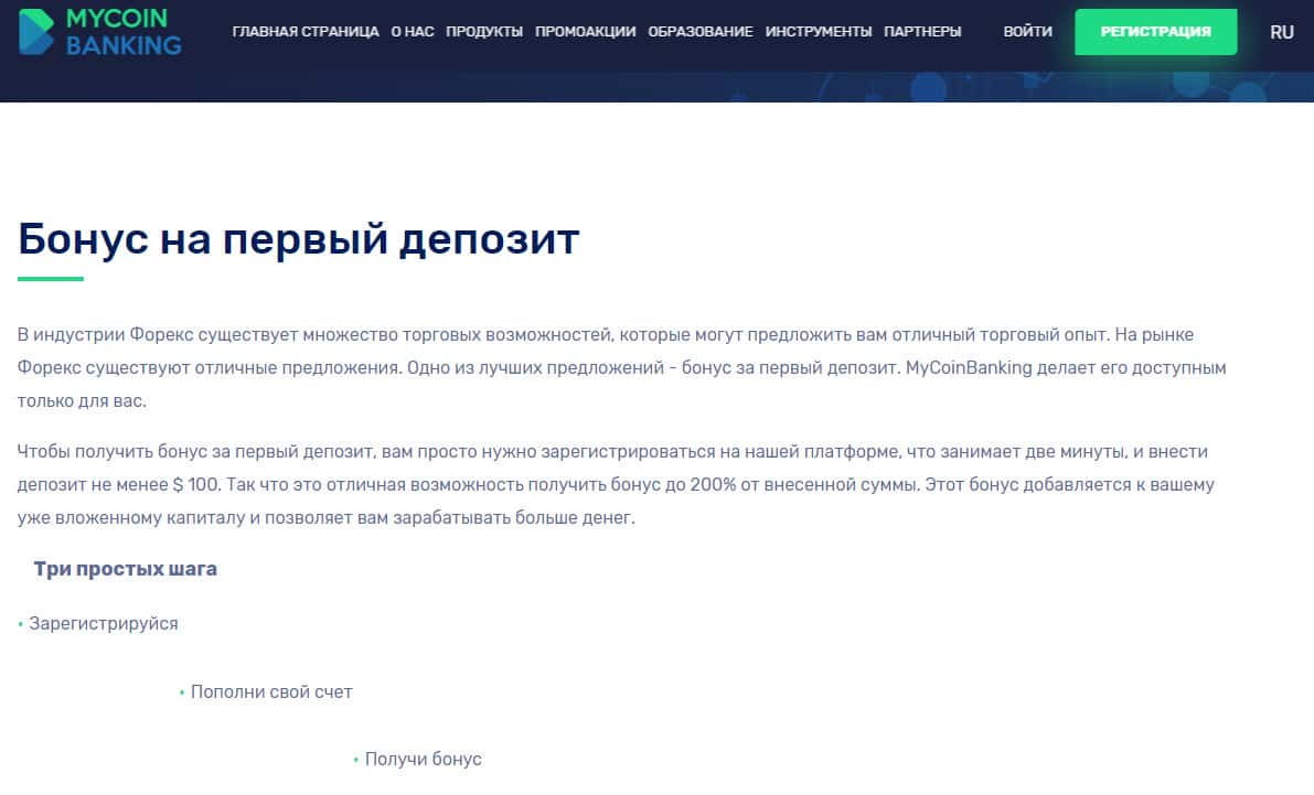 Дабы привлечь побольше наивных пользователей аферисты MyCoin-Banking сделали начальный депозит низким, а именно сто долларов. Но помимо этого лохотрон Ми Коин Банкинг предлагает удвоение данного депозита, что говорит о том, что шулера MyCoin-Banking реально подкручивают котировки и никакой торговли у них не происходит, а деньги сразу идут в карманы жулья.