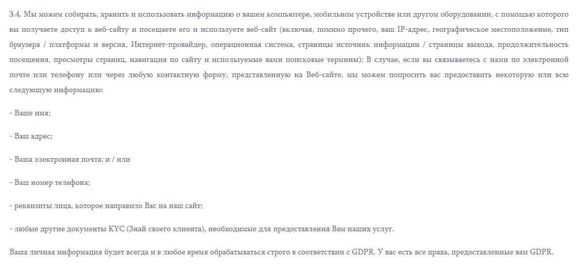 Далее в политике конфиденциальности лохотрона MyCoin-Banking следует довольно сомнительный раздел, в котором аферисты Ми Коин Банкинг перечисляют перечень данных, которых они требуют от наивных пользователей сети интернет. Однако данный перечень довольно размытый, да и жулики MyCoin-Banking оставляют себе возможность затребовать любую информацию.