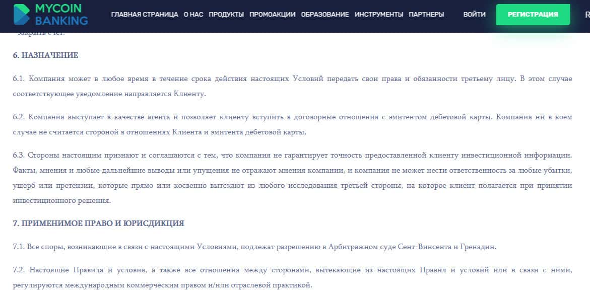 Завершаются же условия сотрудничества лохотрона MyCoin-Banking информацией о том, что аферисты Ми Коин Банкинг оставляют за собой право слиться в любой момент, а так же в случае возникновения споров все суды с проходимцами MyCoin-Banking будут происходить непосредственно на территории оффшора, о чем вы можете прочесть на изображении ниже.