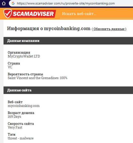 scamadviser com - сайт с технической информацией о лохотроне MyCoin-Banking
