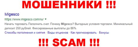 Мигеско - очередные мошенники сети интернет, которые зарабатывают на разводе обычных пользователей сети интернет под предлогом торговли форекс, в ходе которой разводят наивных клиентов на деньги. Связываться с лохотроном Migesco мы вам определенно не рекомендуем !!!