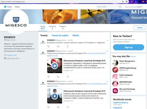 Ну и напоследок затронем страницу аферистов Migesco в социальной сети Твиттер, которая аналогично предыдущим страницам создана исключительно для виду и является одним из средств для распространения и публикации рекламы мошеннического проекта Мигеско, рассчитанного на развод наивных пользователей.