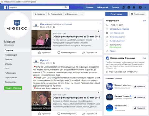 Дабы соответствовать всем современным трендам аферисты Мигеско обзавелись страницами в социальных сетях, одной из которых стал Facebook. Активности на странице шулеров в социальной сети никакой нету, хотя подписчиков и отзывов накручено нормальное количество.