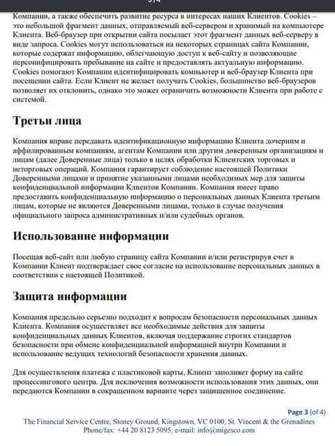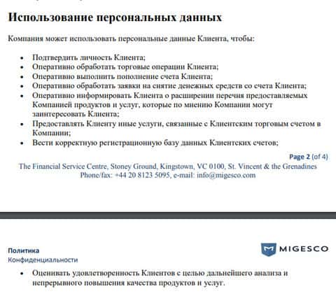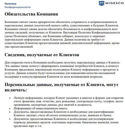Политика конфиденциальности у аферистов Мигеско, аналогично условиям сотрудничества представлена в отдельном PDF, документе, который начинается с условий того, что клиент обязан предоставлять свои личные и персональные данные, список которых вы можете увидеть на изображении ниже.