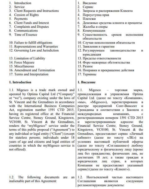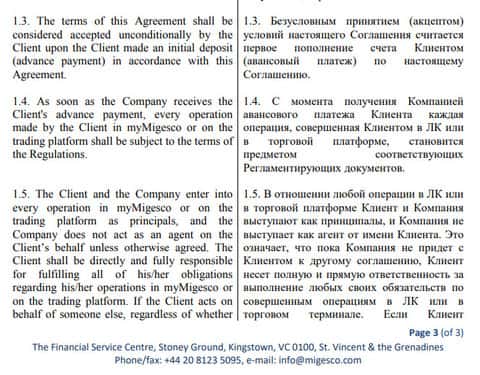 Клиентское соглашение у аферистов Migesco вынесено в отдельный PDF файл, на который ведет одна из ссылок сайта шулеров Мигеско. На изображении ниже вы можете увидеть информацию о месте регистрации лохотрона Migesco с клиентского соглашения, которое является оффшором.