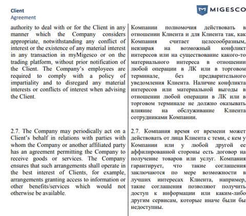 Ну и отказывается полностью мошенническая контора Migesco от ответственности в том моменте клиентского соглашения, когда заявляет о том, что может действовать в сторону клиента так, как посчитает сама целесообразным, что говорит о полном отсутствии прав у клиента шулеров.