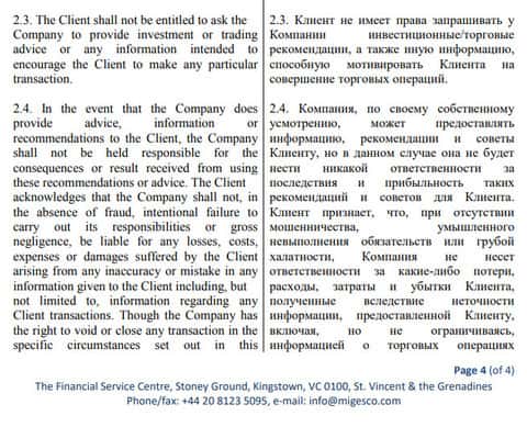 Ответственность за действия персональных менеджеров-аферистов и советы самих же шулеров Мигеско, жулики снимают в следующем разделе клиентского соглашения, предупреждая о том, что непосредственно сам клиент несет ответственность за все свои убытки у аферистов Migesco.