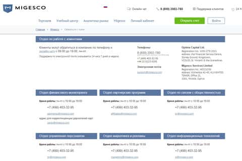 Несмотря на явную мошенническую деятельности жулики Migesco все же разместили на своем подвальном сайте раздел с контактами, в котором привели довольно неплохое их количество. А увидеть же сами контакты подвального мошеннического лохотрона Мигеско вы можете ниже: