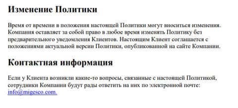 Завершается сама же политика конфиденциальности лохотрона Мигеско информацией о том, что мошенники Migesco могут в любой момент изменить данную политику по своему усмотрению. На изображении ниже вы можете увидеть окончание политики конфиденциальности шулеров.