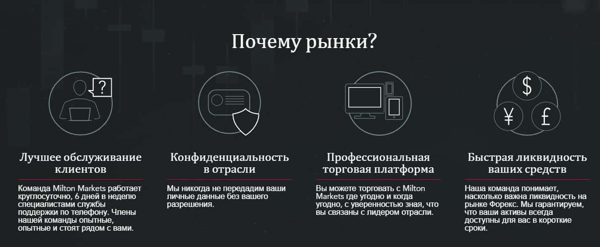 Первый раздел веб-сайта липовой брокерской компании Милтон Маркетс посвящен перечислению основных составляющих, почему именно их должен выбрать потенциальный трейдер. Мошенники якобы предлагают лучшее обслуживание, конфиденциальность в отрасли, быстрая ликвидность средств, профессиональная торговая платформа. По факту, ложь.