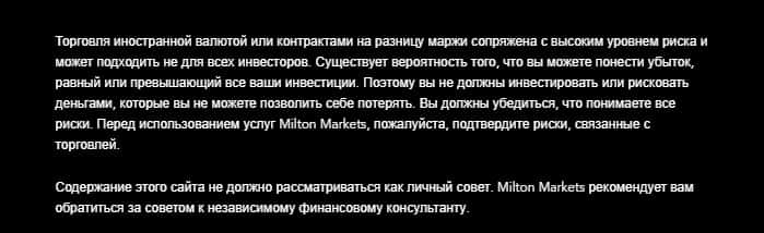 И заканчивается мошенническая интернет-страница информацией о том, что махинаторы из Milton Markets на своем ресурсе, пытаясь замылить глаза трейдерам, предупреждают их о том, что торговля на форекс рынке сопряжена с высоким уровнем риска и возможной потерей средств. Но, жаль, что не предупреждают, что они и есть главная угроза для клиентов.
