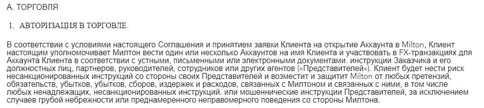 Далее переходим к разделу "Авторизация в торговле", где махинаторы Milton Markets полностью возлагают на наивных клиентов все риски, возмещения издержек и расходов, которые могут случиться даже незапланированно. В общем, мало того, что они постоянно сливают депозиты трейдерам, так еще и незаконно возлагают на них бремя ответственности.