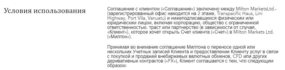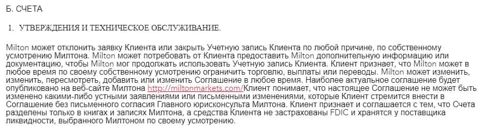 Клиентское соглашение проходимца-брокера Милтон Маркетс
