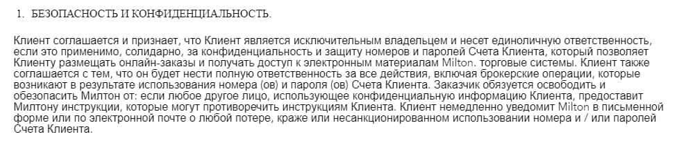 В еще одном разделе договора "Безопасность и конфиденциальность" творится полное беззаконие и хаос, потому что и здесь на лицо проявляется ущемление прав вкладчиков, а также махинаторы Милтон Маркетс не несут никакой ответственности за операции и счета, проводимые с ними.
