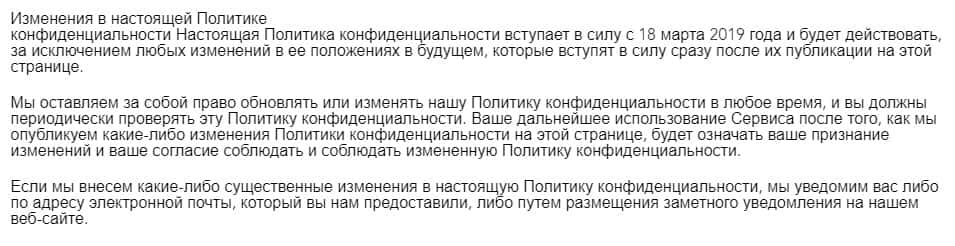 В предпоследнем разделе грабительской политики конфиденциальности "Изменения в настоящей Политике" говорится о том, что эти шарлатаны оставляют за собой право обновлять или изменять данные. А трейдеры обязаны самостоятельно следить за этим, то есть происходит полный беспредел и накручивание собственных условий наивным пользователям.