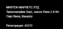 И только внизу веб-сервиса махинаторской организации Milton Markets можно разыскать адрес, который располагается далеко за границей - в известной зоне Вануату, куда подобные жулики любят сливать депозиты несчастных форекс трейдеров. Но ни телефона, ни почты эти ворюги не предоставили клиентам. Ниже приведены контакты для связи с этими ворами: