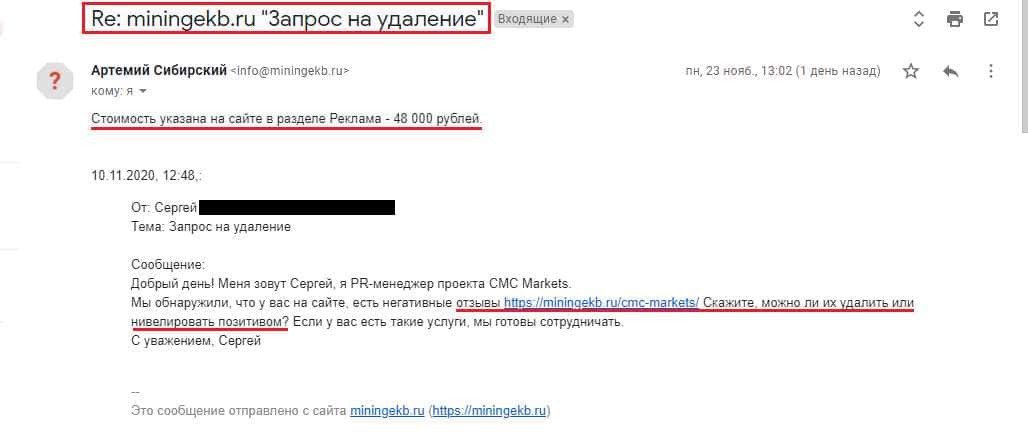 Ниже представлена переписка пользователя с фальшивым отзовиком MiningeKB Ru. Пользователь просит удалить негативные отзывы. Стоимость услуги составляет 48000 рублей.