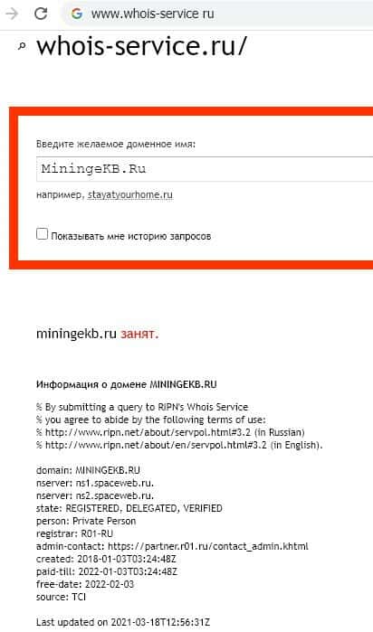 - На кого зарегистрирован домен мошеннического портала MiningeKB Ru?
