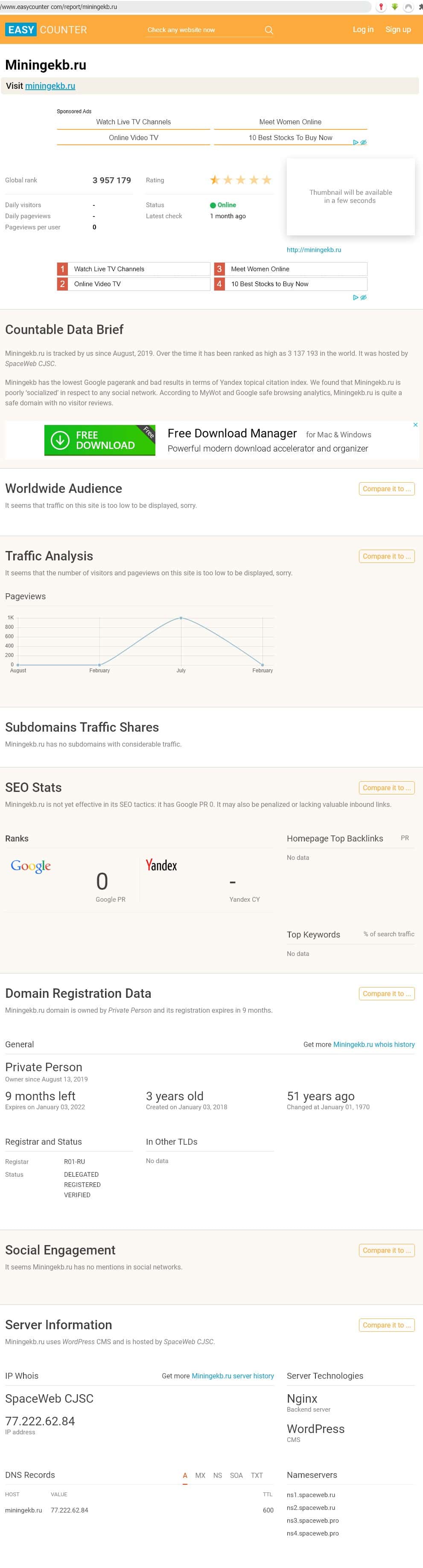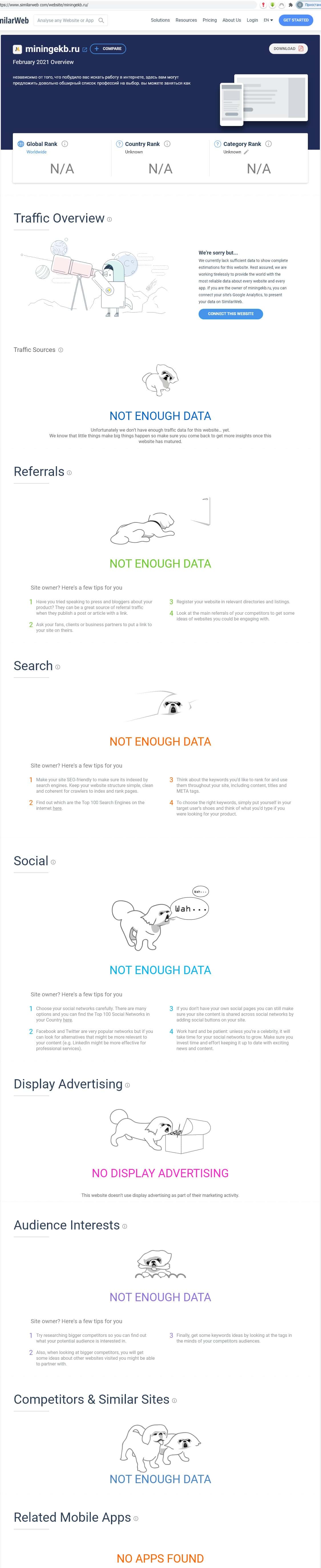 Вопреки желаниям аферистов из MiningeKB Ru, их сайт не пользуется популярностью. Его трафик настолько мал, что сервисы similarweb бессильны в анализе его работы.