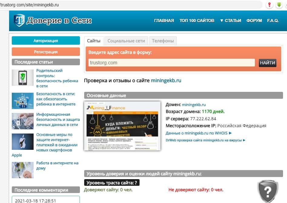 Портал "Доверие в сети" затрудняется вынести свой вердикт доверия сайту MiningeKB Ru, несмотря на его возраст более трех лет, ввиду отсутствия отзывов и оценки его деятельности.