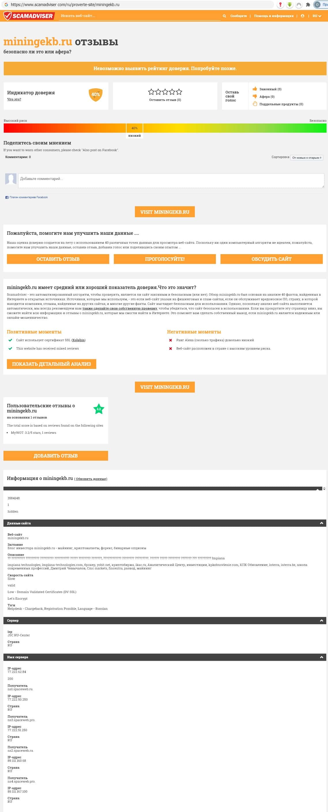 Несмотря на низкий трафик сайта MiningeKB Ru, портал scamadviser com, все же проанализировав его характеристики, не рекомендует доверять этому жульническому ресурсу.