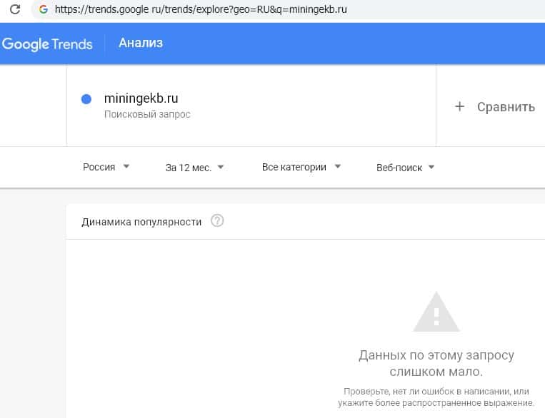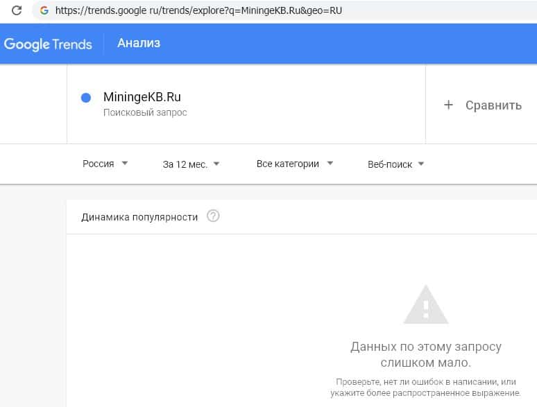 Аналогичная ситуация и с поиском самого портала мошенников "miningekb.ru" в поисковой системе Гугл. Популярностью поиска данного проекта и "не пахнет".