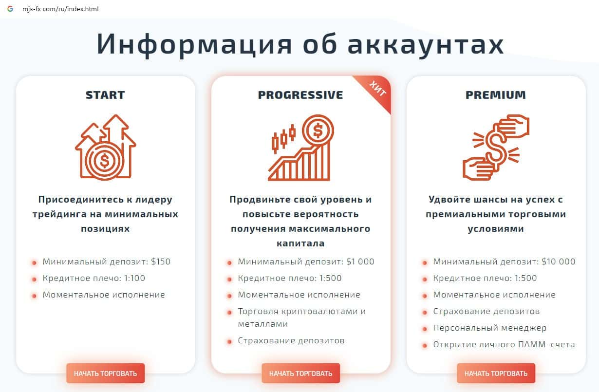 - Типы торгового счета на онлайн-портале скам-брокера MJS FX
