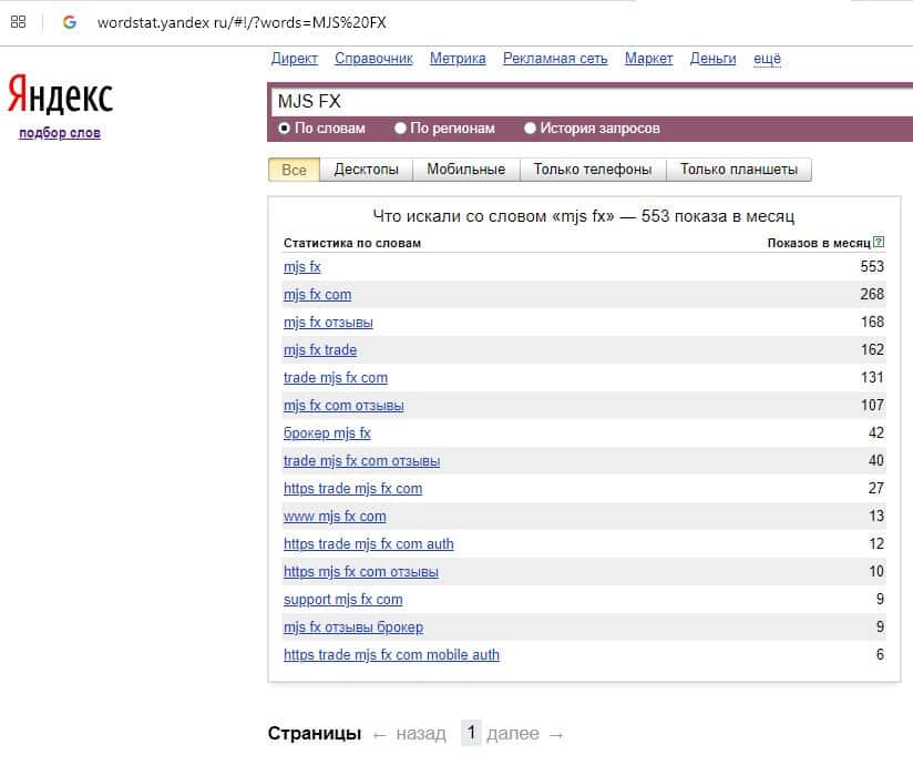 Количество брендовых запросов названия компании на английском языке "MJS FX" на Яндекс Вордстарт составляет 553 показа за месяц.